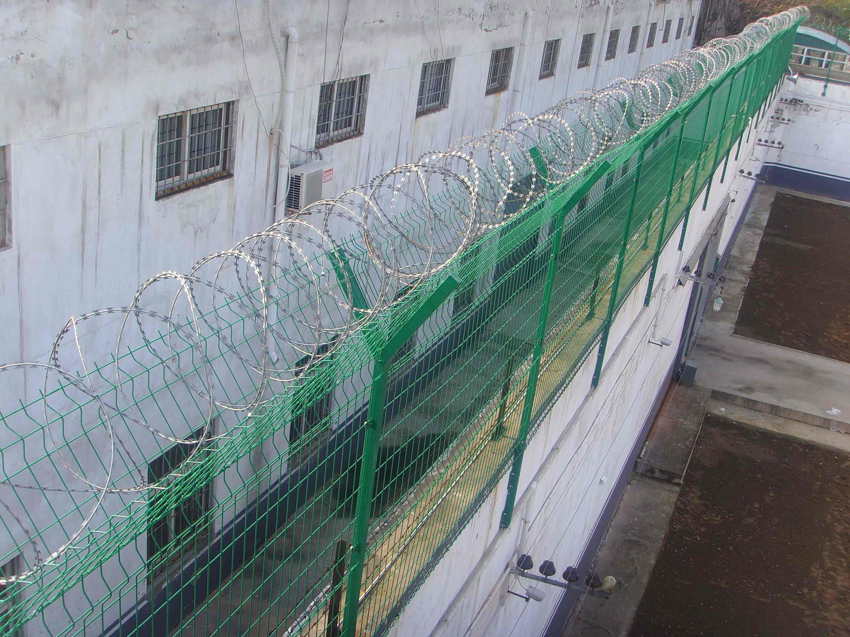 監獄防護網又稱監獄護欄網或監獄隔離柵,主要是采用高強度的刀片刺網與普通防護網的結合,由V型支架立拄,加強型焊接片網,安全防盜連接件和刀片刺網組成。刀片刺網是一種新型防護網,由銳利尖角鍍鋅鋼板或不銹鋼薄板做刀片,鋼絲做芯線組合而成的防護器材。