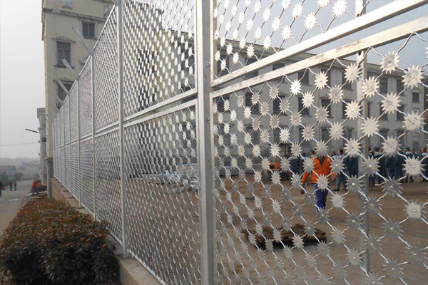 梅花刺護(hù)欄網(wǎng), 主要是采用高強(qiáng)度的刀片刺網(wǎng)與普通防護(hù)網(wǎng)的結(jié)合,由V型支架立拄,加強(qiáng)型焊接片網(wǎng),安全防盜連接件和刀片刺網(wǎng)組成。刀片刺網(wǎng)是一種新型防護(hù)網(wǎng),由銳利尖角鍍鋅鋼板或不銹鋼薄板做刀片,鋼絲做芯線組合而成的防護(hù)器材。